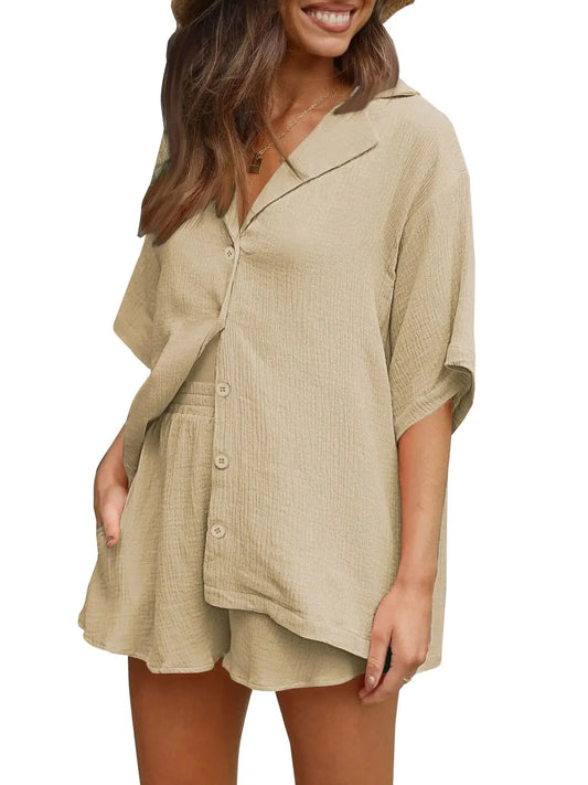 2 Piece Womens Outfit Sets Button down Shirts and Shorts Casual Lounge Sets Short Sleeve Pajamas Sets Summer Loungewear